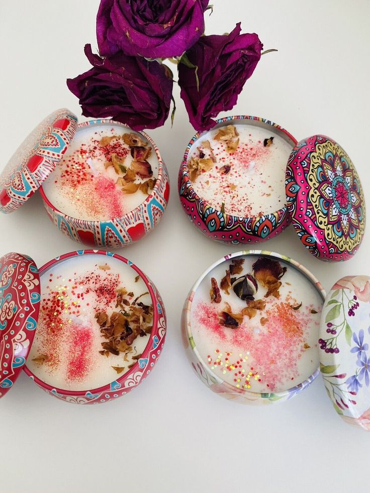 Decorative tin jar candles featuring colorful Jaipuri patterns. Infused with dried petals and glitter for a festive look.